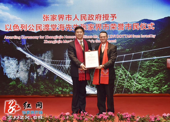 虢正貴說,授予渡堂海先生張家界市榮譽市民是中以兩國友誼深厚的標志,也是張家界與以色列合作交流的新開端。渡堂海設計的張家界大峽谷玻璃橋不僅外形壯觀獨特,還包含了豐富的文化內涵,也帶來了可觀的經濟效益,代表了智慧、力量和信心,體現了無窮無盡的生命力,是旅游之橋也是友誼之橋。虢正貴希望,渡堂海先生繼續關注張家界的發展,在弘揚中以友誼、傳承兩國文化、傳播文明成果等方面多做貢獻,更多的造福兩國人民。