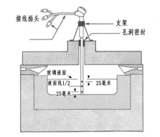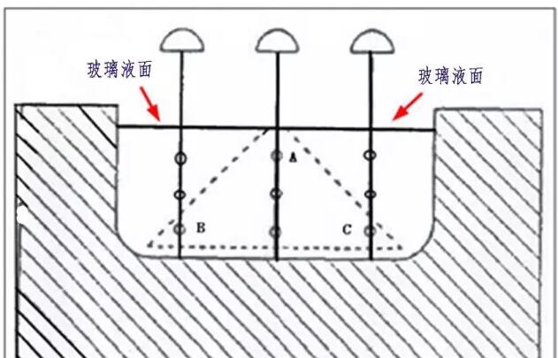 (1)首先是垂直方向:下部測點距槽磚底向上25毫米(如圖二的B點、C點),上部測點距液面向下25毫米(如圖二的A點、),中間測點為玻璃液面的1/2處。如圖三: