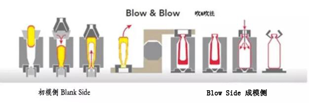 吹&吹法:在I.S行列機上制作小口瓶制造瓶的原理。我們常使用的方法。玻璃先在初模中吹制,然后在成模再吹制成玻璃瓶。