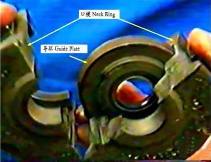 口模它是由二瓣口模與一個口環組成??诃h裝在口模內,瓶口頂部的密封面是由此口環形成的,整個瓶口是由此口模形成的。同時口模它夾撐著初料坯從初模側翻轉到成模里??诃h有時我們也稱為口板。