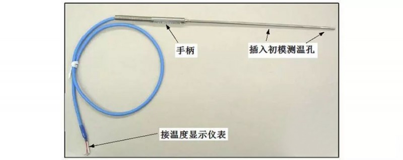 操作工手握住該熱電偶的手柄將其插入初模的測溫孔,即可進行手工測溫。其示意圖見圖二。
