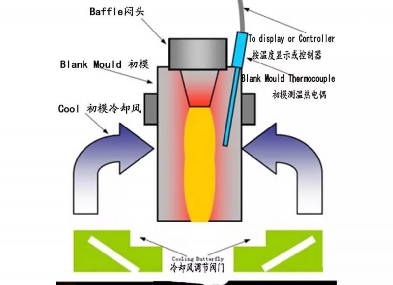 料滴從供料機落下進入初模腔,它的溫度約在1180℃左右,經制瓶機近三十個制瓶工序到鉗瓶鉗出,此時此熱瓶的溫度在600℃左右,期間玻璃液溫度下降大580℃以上。這些大量的熱能由玻璃液傳遞到模具,模具又通過冷卻風將此熱量散發出去,使模具溫度保持在一定的范圍內。初模的溫度測量(Blank Operating Temperatures)無疑在制瓶中是最重要參數之一,行話說得好:制瓶的質量控溫度又是其成功的第一步。初模溫度測量的發展其中包括: