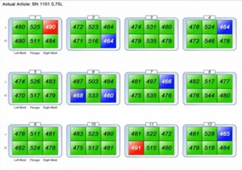 圖六中12塊數值表示制瓶機有12臺組機,每塊有上下二排表示是雙滴料,每塊左面表示初模左面腔室的溫度,中間是沖頭(或者芯子)的溫度,右面表示初模右面腔室的溫度。綠色表示溫度在正常范圍內。紅色表示被測的初模超溫,藍色表示被測的初模溫度過低。