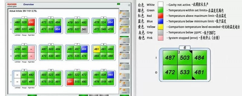 其中白色表示此模腔沒有工作,綠色表示溫度在正常范圍內,紅色表示被測的初模超溫,藍色表示被測的初模溫度過低,黃色表示溫度超出對比的溫度值,灰色溫度低于350℃,粉色表示系統出錯。這樣的顯示可使操作者一目了然。當然這些被測初模溫度信號也可輸入溫度調節器里,在電腦里進行比較分析后其輸出可自動控制各初模的溫度值。該系統可真正做到自動測溫了。