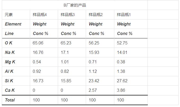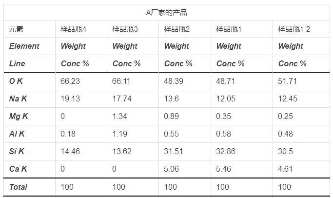 結構的分析是需要依靠昂貴的設備才能觀察到。加之不是生產高端光學、電子玻璃,所以難以顯現其特殊的作用。當產品抗沖擊、耐內壓性能有較大的波動時可以委外分析對比分析一下。下面是委托蘭州大學同學EDS設備測試數據,數據表明瓶子與瓶子之間、廠與廠之間玻璃表面的成分存在著較大的差異,當明顯的差異又和其他因素偶合時就可能會表現出顯著的品質差異。