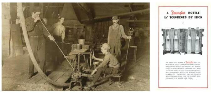 圖三是當(dāng)年手工吹瓶時(shí),圖左可見開模小工在操作金屬模以及圖右是當(dāng)年推廣金屬模具的廣告。