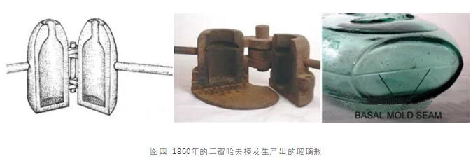 圖四左是該二瓣式模具的示意圖,初料胚轉(zhuǎn)到此模具后,工人操作二側(cè)的手柄將其關(guān)閉,吹成熱瓶后將其打開,把熱玻璃瓶鉗出完工。圖四中是當(dāng)年實(shí)際使用的二瓣式成模留下的照片,此類模具制造出的玻璃瓶如圖四右,據(jù)考證它約是1860年的二瓣哈夫模所生產(chǎn)的玻璃瓶。