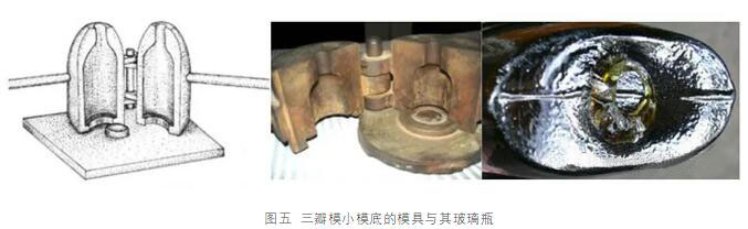 圖五左是該三瓣式模具的示意圖,圖五中是當(dāng)年實(shí)際使用的三瓣式成型模的照片,圖五右是此類模具制造出的玻璃瓶,其瓶底有一深深的接縫線。因此這種玻璃瓶它也擺不穩(wěn)。