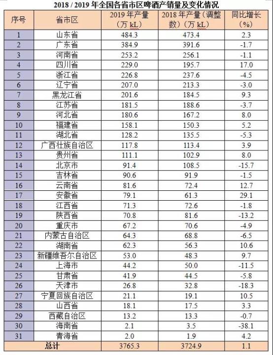 2019年我國啤酒產量完成3765.3萬kL,比上年同期(調整數3724.9萬kL)增長1.1%(如按當年公布數3812.2萬kL計算為-1.2%),產量凈增長40.4萬kL。人均占有量為26.9L,比上年下降0.4L。如以消費量來計算,則2019年啤酒總消費量為3796.3萬kL,比上年同期增長0.8%,人均消費量為27.1L,比上年上升0.4L。